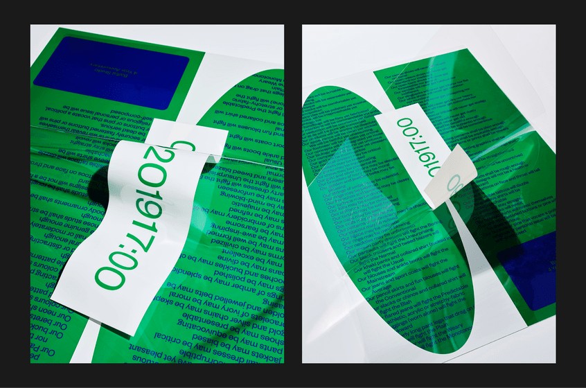 The invitations were accompanied by a transparent plastic envelope in which was placed the invitation flyer for the evening, featuring the address, dates and a text composed by experimental poet Steve Savage.