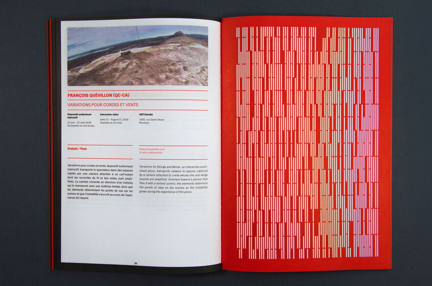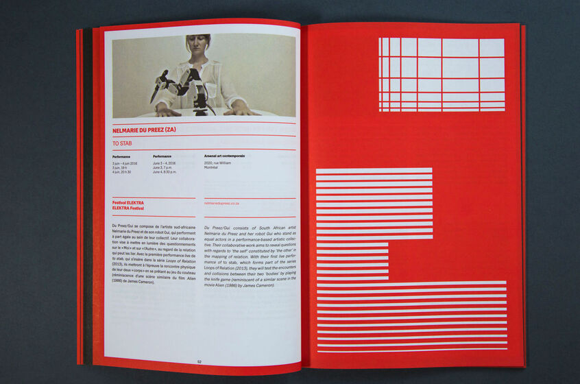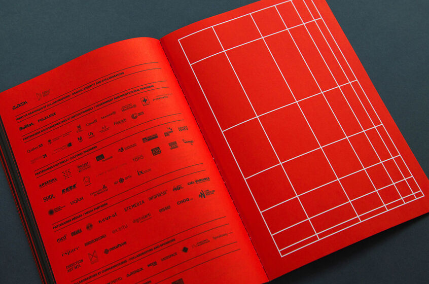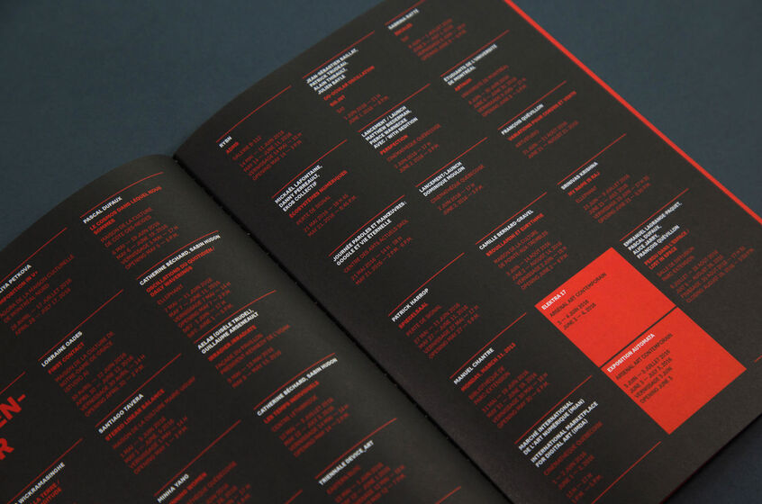 The BIAN identity was conceptualized by applying a design that is very Swiss, organized and precise. In order to activate this concept, we chose right-angle frames as a compositional cue, squares that delineate space and allow for a striking contrast in the centrepiece colours: red, black and white. Within this framework, the interplay of repeating lines and printer traces on canvas or fabric evoke mechanical rhythms. Showcasing a photo from the Inferno performance, the Biennale centrepiece reaffirms the BIAN theme while signaling the main elements of the program and the events ahead.