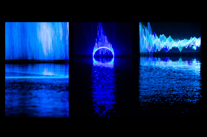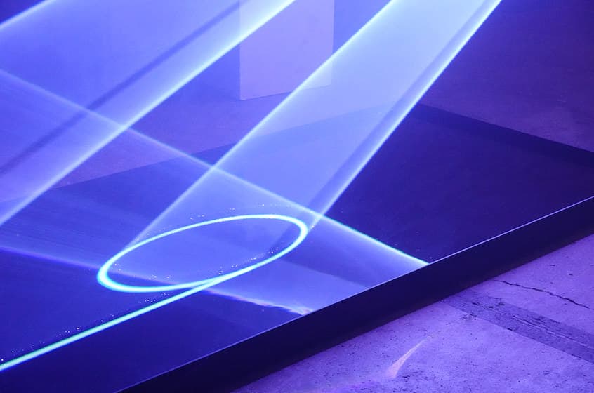 "Laser Like Water" is a digital art installation created by Baillat Studio, Jean-Sébastien Baillat, Patrick Trudeau, and Ottomata. The project was intended as a meeting of various elements that together give rise to new perceptions of those same elements only possible as a result of their amalgamation. The piece is composed of brightly-coloured lasers and shining ropes that slice through the air, fall apart upon contact with water, then are reflected and deposited onto a mirrored screen ultimately resulting in the creation of new abstract forms.