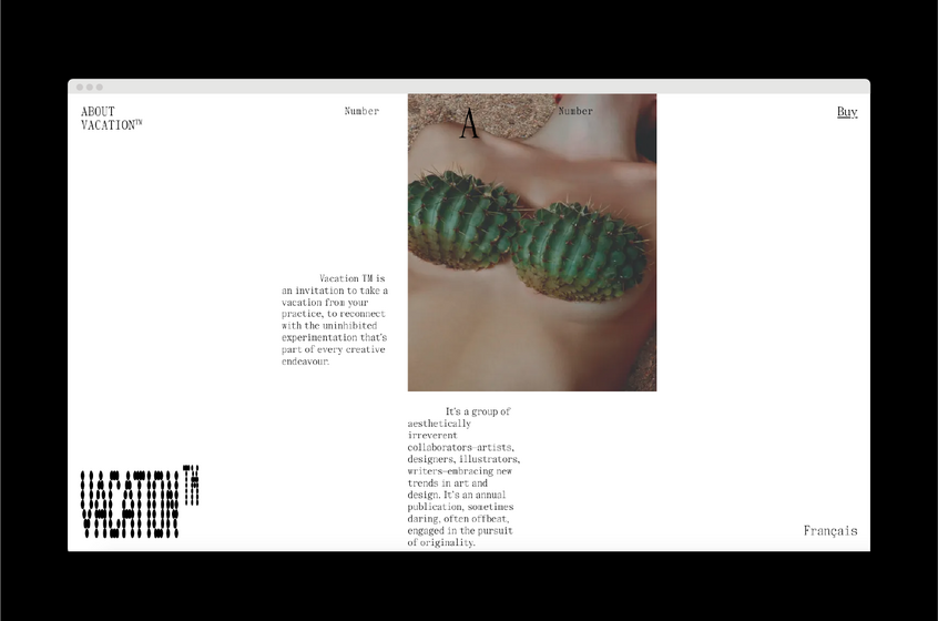 Vacation™️ is an annual publication, sometimes daring, often offbeat, engaged in the pursuit of originality. It's an invitation to take a vacation from your practice to reconnect with the unhibited experimentation that's part of every creative endeavour. It's a group of aesthetically irreverent international and local collaborators — artists, designers, illustrators, writers —embracing new trends in art and design. Created and curated by Baillat Studio, the magazine is produced in limited editions : 100 hand-numbered copies.